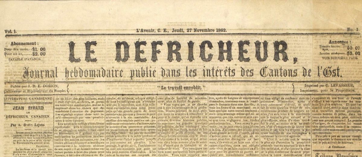 A friend offered him the position of writer for a newspaper, Le Défricheur, in L’Avenir, Centre-du-Québec. Considering it a great challenge and a good reason to leave the city, Wilfrid Laurier moved alone to L’Avenir on November 18, 1866. Quick to find his bearings, he infused the newspaper with his ideas and political positions.