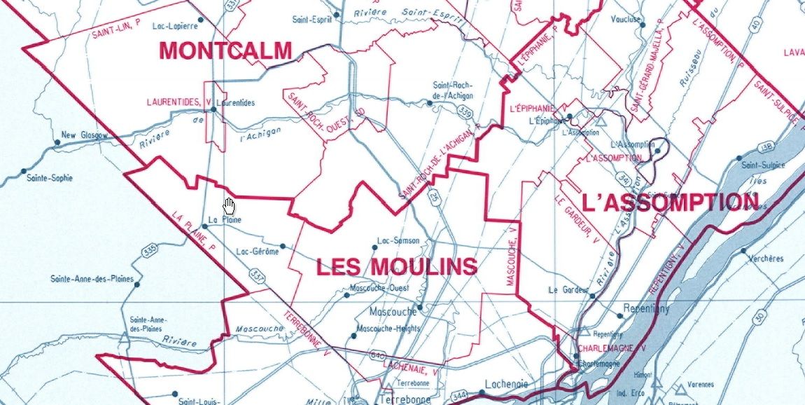 Carte représentant les trois villes principales de la jeunesse de Laurier. L'assomption au centre à droite, Saint-Lin en haut à gauche et New Glasgow un peu plus bas à gauche.
